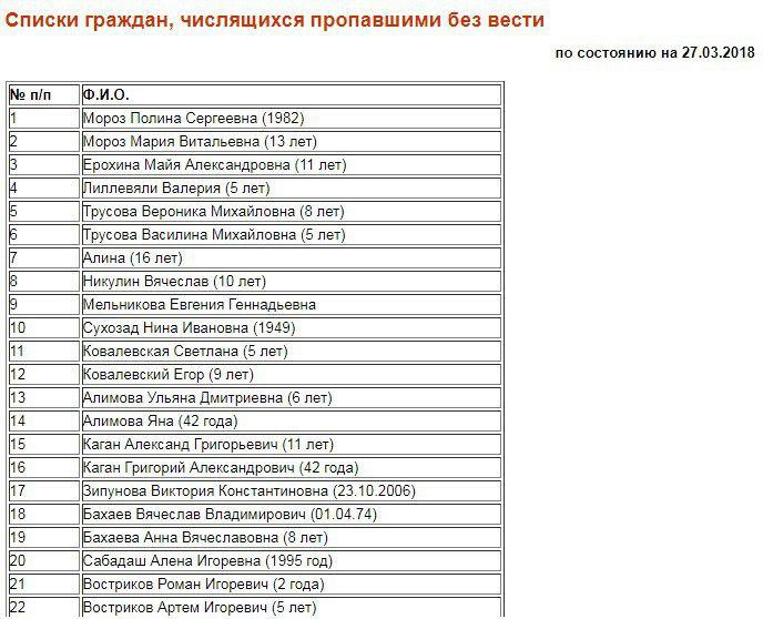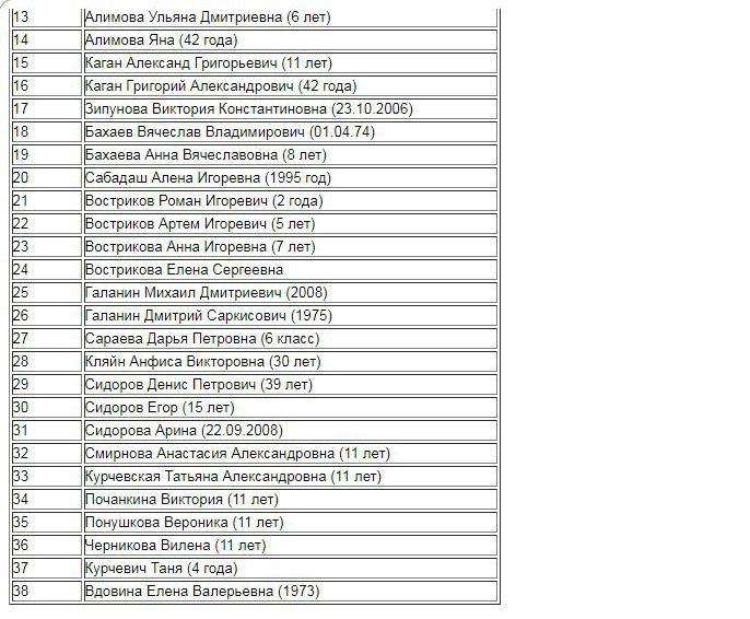 В списках пропавших без вести числятся 38 человек. В список погибших вошли люди, чьи личности удалось установить. На данный момент среди их числа 25 человек.