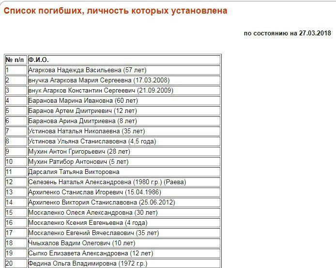 В сети опубликовали список пропавших без вести и погибших в результате крупного пожара в торговом центре "Зимняя вишня" в Кемерово.