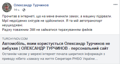 "Прочитал в интернете, что на меня покушались, а машину взорвали. Мечты недоеденных снегирей не осуществились. Я и мой автотранспорт невредимы. Советую важным СМИ не заниматься тиражированием фейков", - заявил Турчинов.