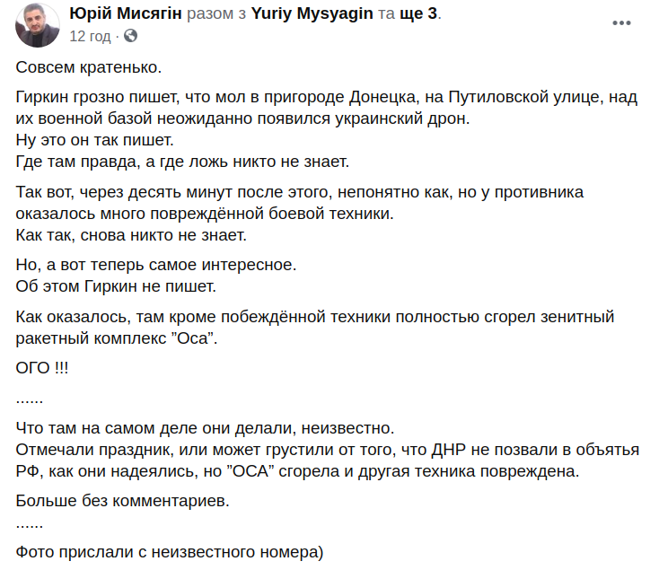 "Как оказалось, там кроме побежденной техники полностью сгорел зенитный ракетный комплекс "Оса"... Что там на самом деле они делали, неизвестно. Отмечали праздник, или может грустили от того, что ДНР не позвали в объятья РФ, как они надеялись, но "ОСА" сгорела и другая техника повреждена", - написал Мысягин.