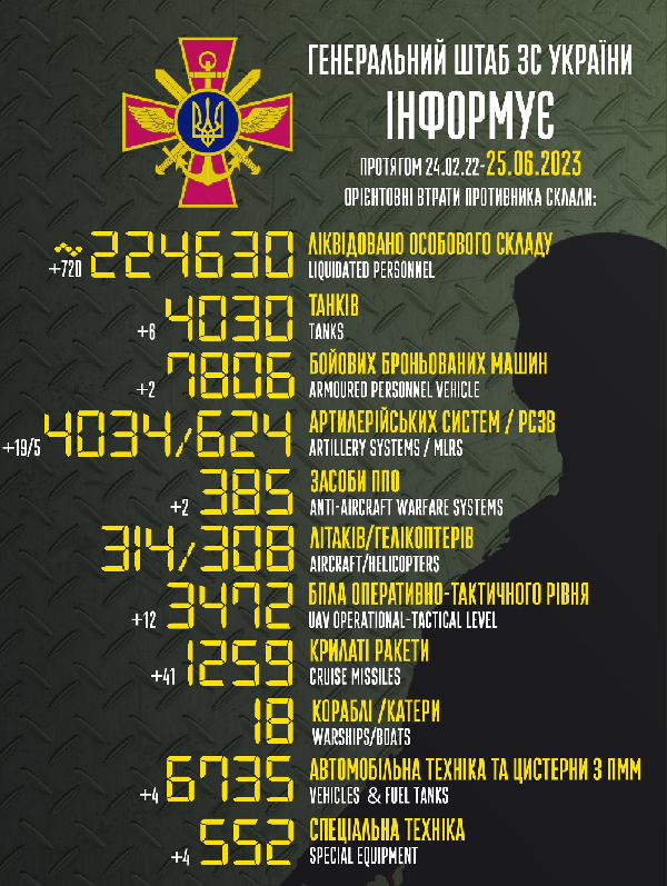 Общие боевые потери противника с 24.02.22 по 24.06.23 ориентировочно составили: