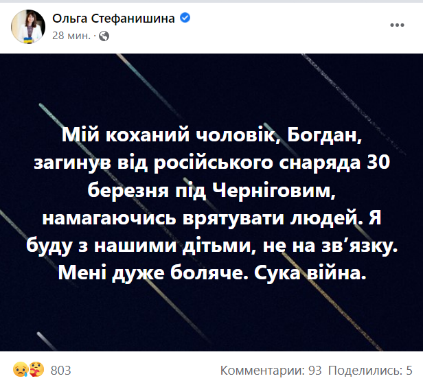 "Мой любимый муж, Богдан, погиб от российского снаряда 30 марта под Черниговом, пытаясь спасти людей. Я буду с нашими детьми, не на связи. Мне очень больно. Сука война", - написала она.