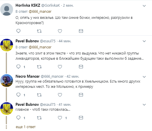 "О, опять у них веселье. Шо там синие бочки, интересно, разгрузили в Красногоровке?", "Знаете, что злит в этом тексте - что это выдумка. Что нет никакой группы ликвидаторов, которые в ближайшем будущем таки выполнили б задание...", "Нууу, группа не обязательно готовится в Хмельницком. Есть много других интересных мест. То же Молькино, к примеру", - пишут комментаторы.