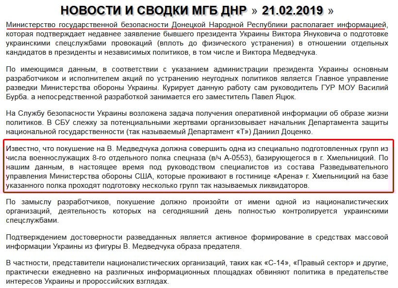 "Известно, что покушение на В. Медведчука должна совершить одна из специально подготовленных групп из числа военнослужащих 8 отдельного полка спецназа (в/ч А-0553), базирующегося в г. Хмельницкий", - написали оккупанты.