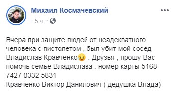 Михаил Космачевский, сосед Владислава, написал на своей Facebook-странице номер банковской карты для финансовой помощи семье парня. (5168 7427 0332 5831 - Кравченко Виктор Данилович (дедушка Влада).