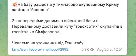 "На базу рашистов во временно оккупированном Крыму посетила "бавовна". По предварительным данным, с военной базы в Перевальном доставили кучу "трехсотых" окупантов в госпиталь в Симферополе. Ждем уточнения от Генштаба", - написал мэр оккупированного Мелитополя Иван Федоров.