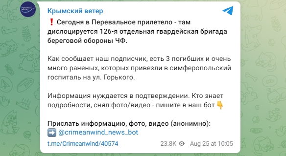 В ночь на 25 августа, "бавовна" пришла в гости в Перевальное, где дислоцируется 126-я отдельная гвардейская бригада береговой обороны ЧФ. В результате 2 оккупанта погибло, еще 7 доставили в госпиталь с ранениями.