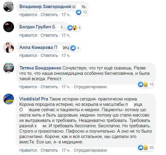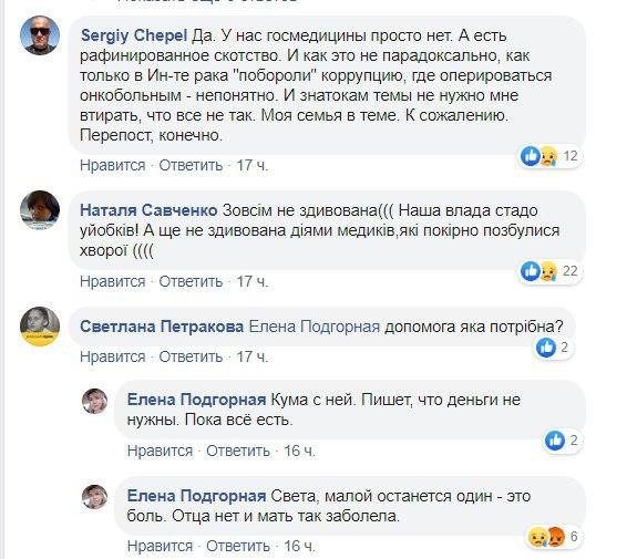 "Люду прооперировали, лечение шло отлично, все было в пределах нормы. Потом Люда почувствовала себя плохо. У нее поднялась температура. Люда 2 раза приезжала к своему лечащему врачу в областной онкоцентр в Киеве. Но там не нашлось палаты для Люды", - пишет Подгорная.