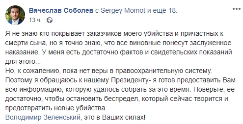 "Я не знаю кто покрывает заказчиков моего убийства и причастных к смерти сына, но я точно знаю, что все виновные понесут заслуженное наказание. Поэтому я обращаюсь к нашему президенту – я готов предоставить Вам всю информацию, которую удалось собрать за это время. Поверьте, ее достаточно, чтобы остановить беспредел, который сейчас творится и предотвратить новые убийства", – сказано в публикации.