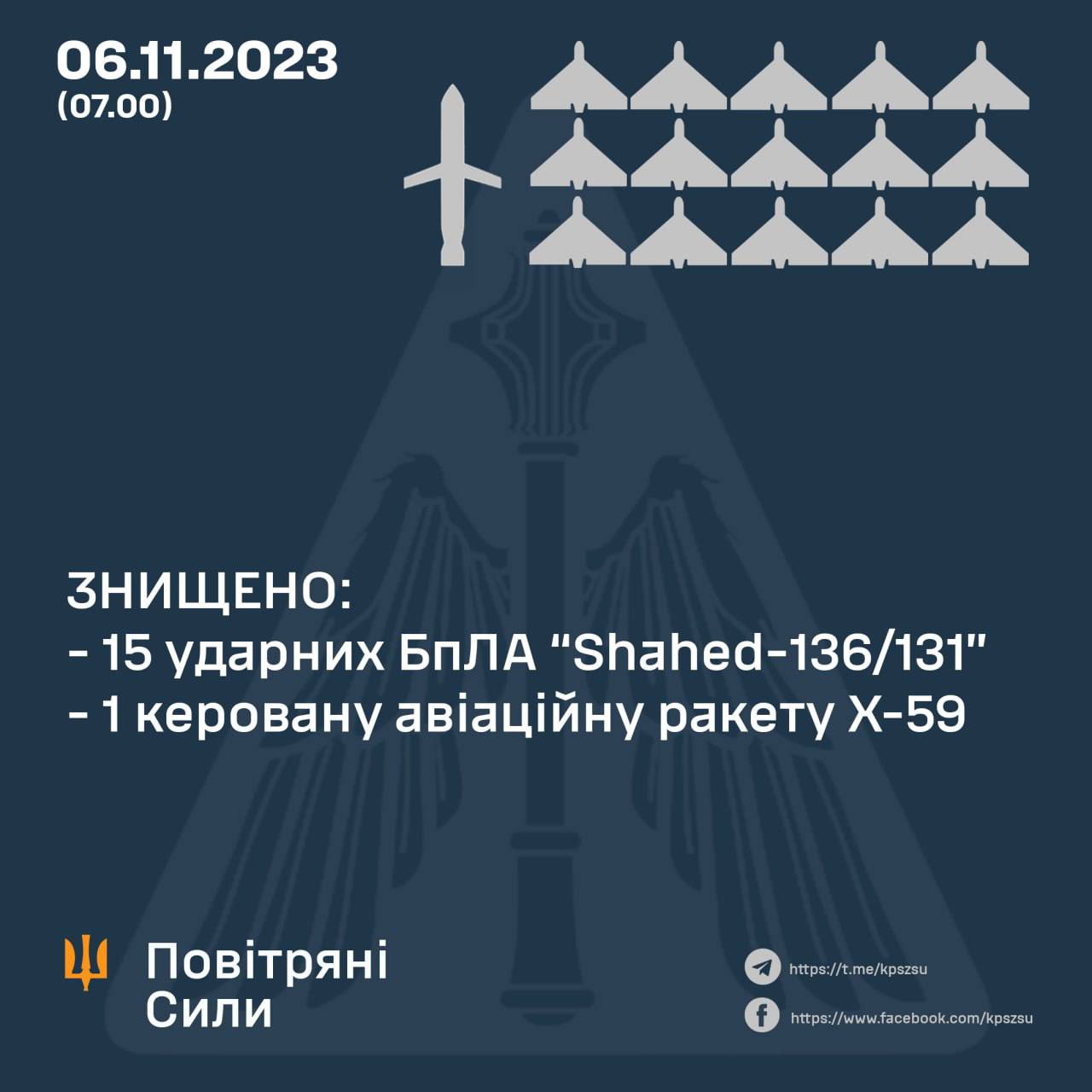 "В результате боевой работы силами и средствами Воздушных Сил, во взаимодействии с ПВО Сил обороны Украины, уничтожены 15 ударных БпЛА "Shahed-136/131" и одна управляемая авиационная ракета Х-59", - говорится в сообщении.
