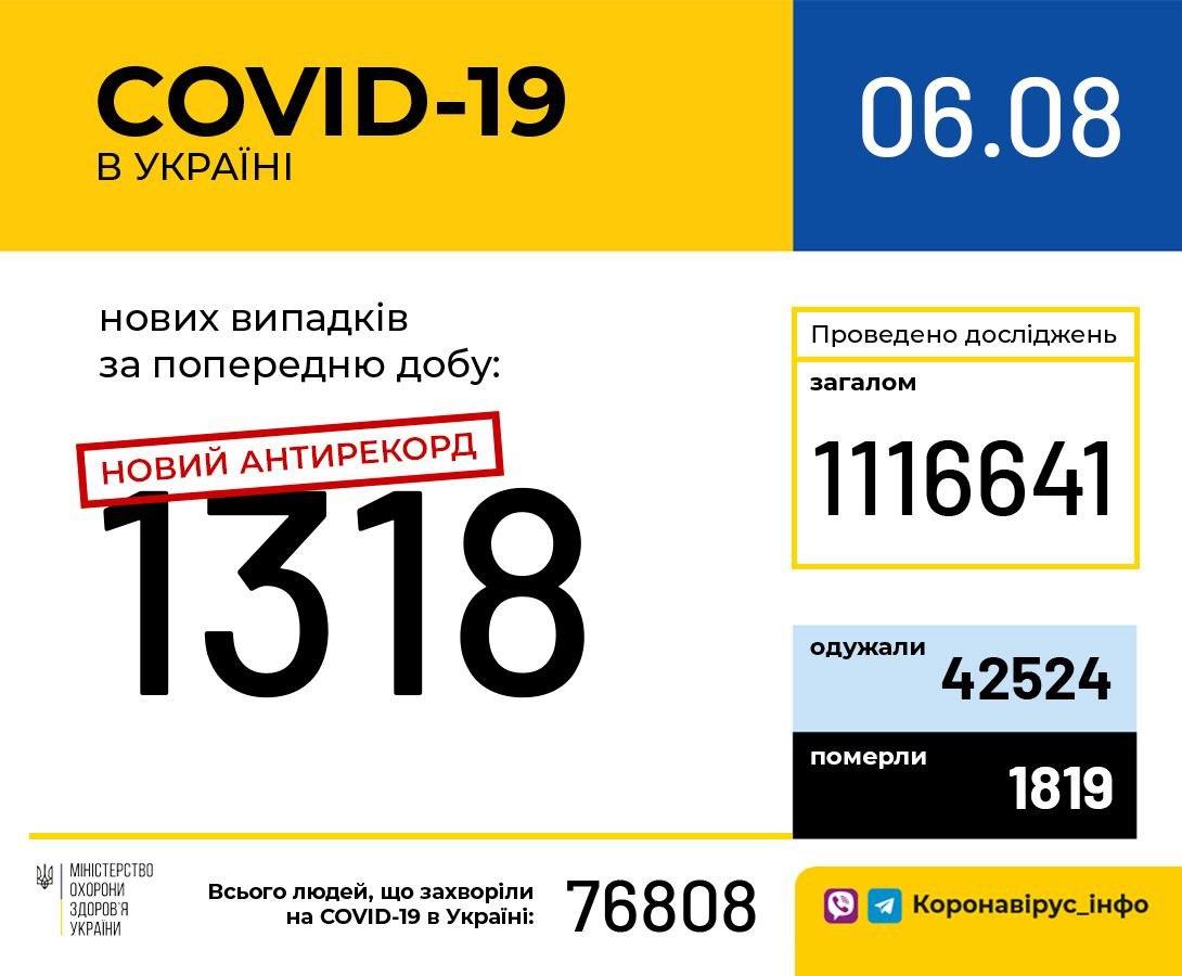 За сутки, 5 августа, в Украине коронавирус подтвердили у 1 318 человек, что стало новым антирекордом с начала пандемии.