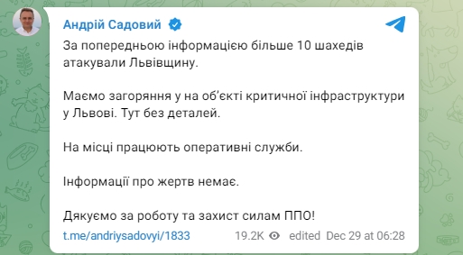 В ночь на 29 декабря россияне снова атаковали Украину ракетами со стратегических бомбардировщиков. Взрывы раздавались в Харькове, Миргороде, Черкассах, Львове.
