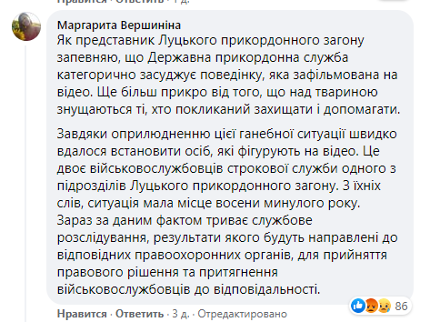 Она написала, что Государственная пограничная служба категорически осуждает поведение, которое снято на видео и добавила, что еще более обидно от того, что над животным издеваются те, кто призван защищать и помогать.