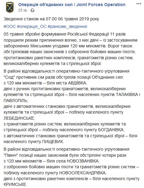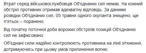 Несмотря на провокационные обстрелы боевиков, потерь среди военнослужащих Объединенных сил нет. Вместе с тем, разведка сообщает, что 5 мая был ликвидирован один боевик, а еще пять - получили ранения.