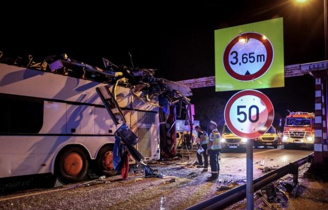 Двухэтажный туристический автобус Setra (номер ВХ 3219 ВА) из Украины на пути к аэропорту Ферихедь на скорости въехал в 3,5-метровый ограничитель высоты.