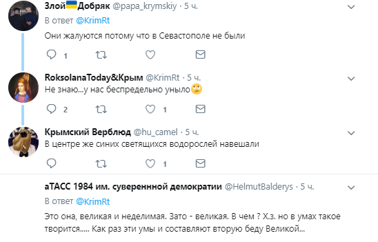 "Они жалуются потому, что в Севастополе не были", "Не знаю...у нас беспредельно уныло", "Это она, великая и неделимая. Зато - великая. В чем? Х.з. но в умах такое творится..... Как раз эти умы и составляют вторую беду Великой...", - пишут комментаторы.