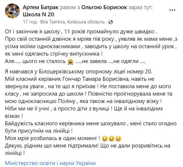 О своей классной руководительнице сообщил один из учеников с инвалидностью Артем Батрак на своей странице в Facebook.