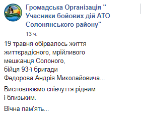 О смерти военнослужащего в Facebook сообщила общественная организация "Учасники бойових дій АТО Солонянського району".