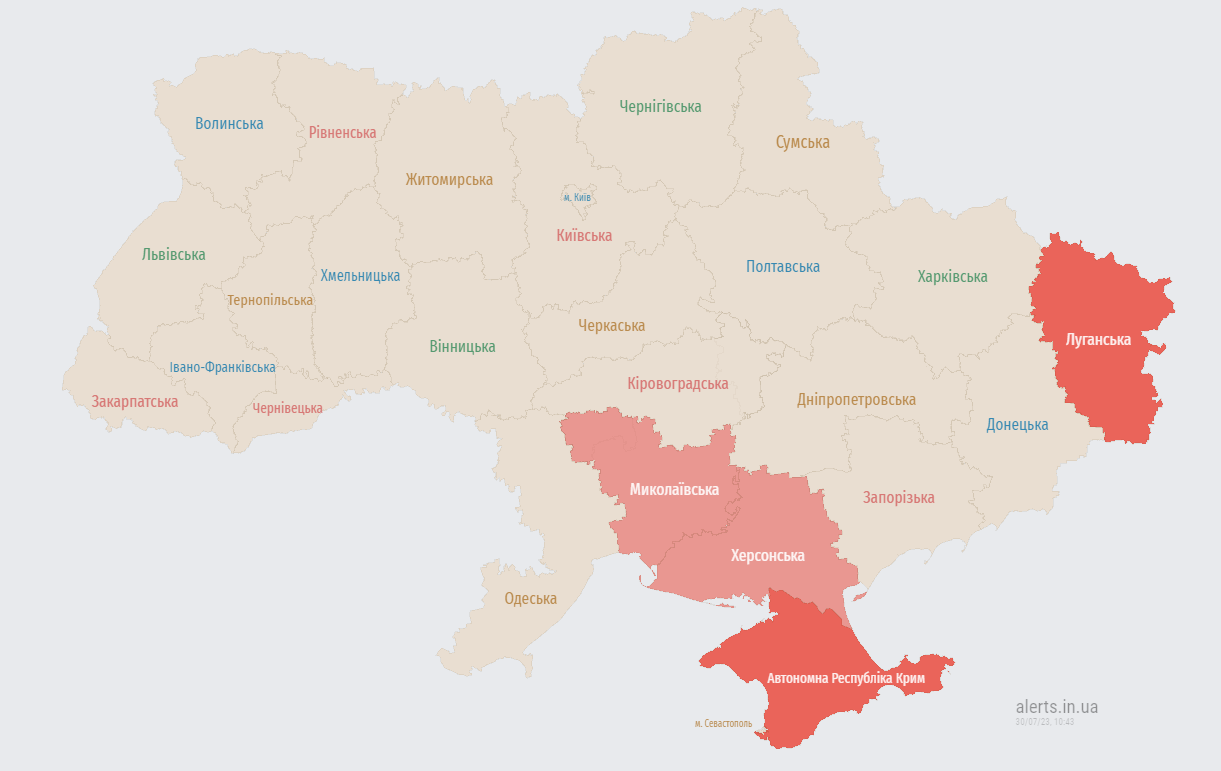 В воскресенье, 30 июля, в 09:36 в ряде областей Украины объявили воздушную тревогу.
