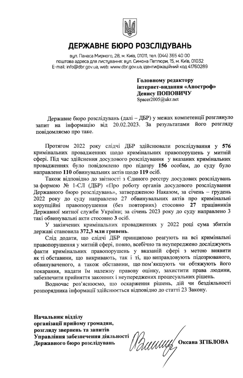 Об этом говорится в ответе ДБР по запросу "Апострофа".