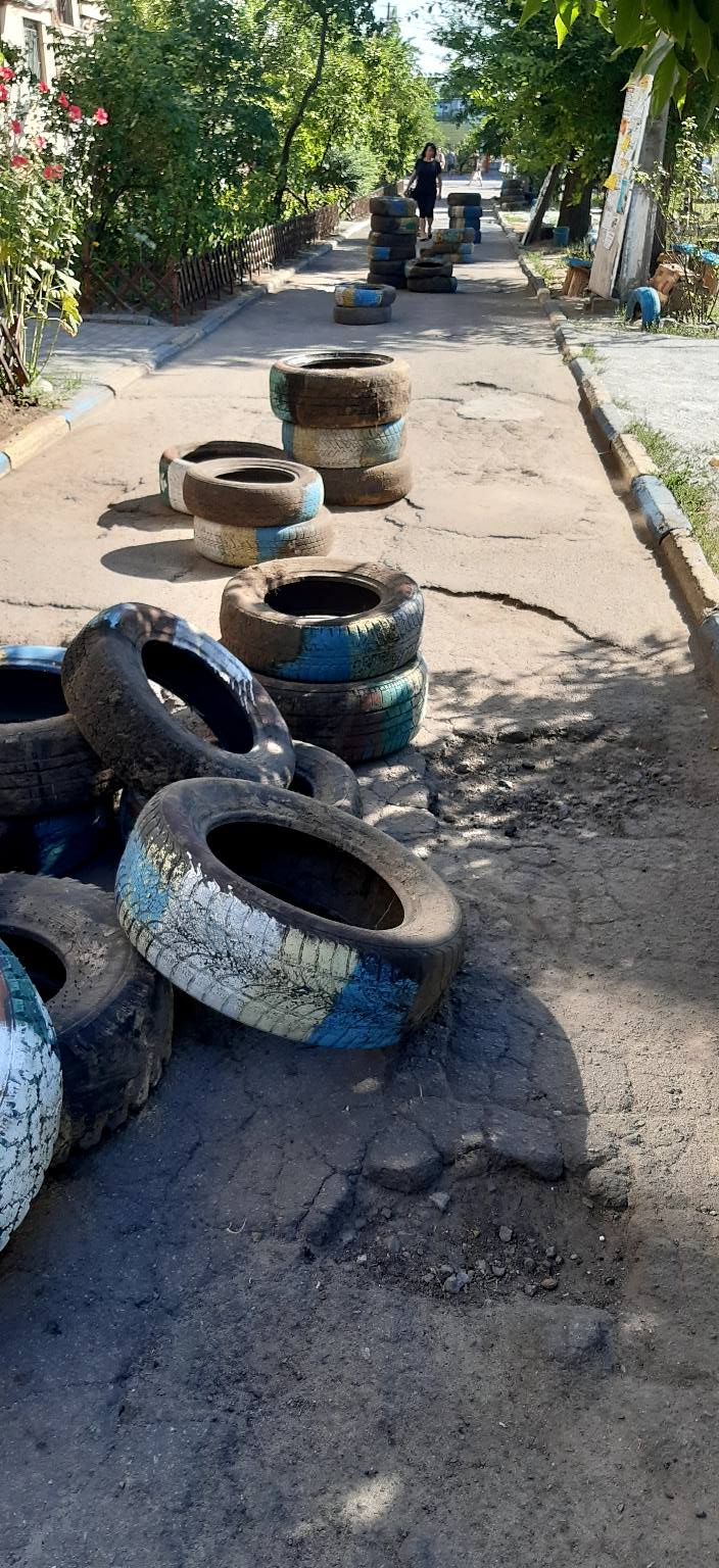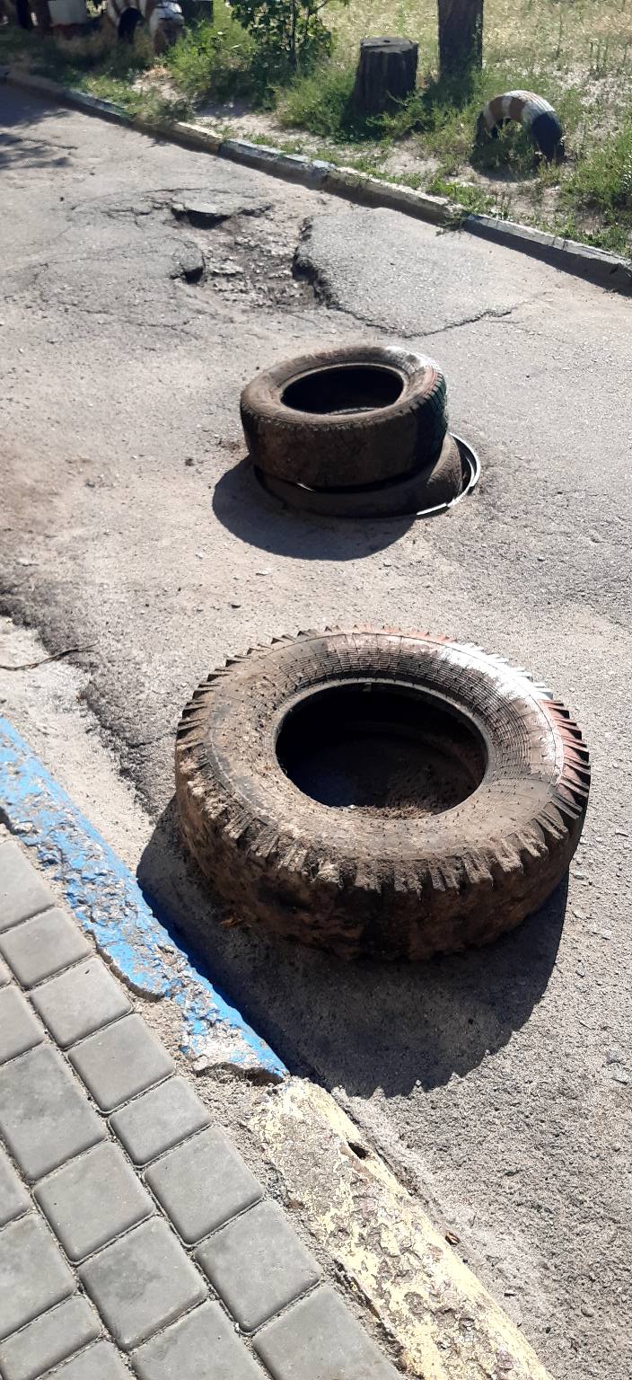 Как написали в комментариях, дорогу заставили шинами специально - так группа местных бабушек борется с тем, чтобы во двор не заезжали и не парковались машины.