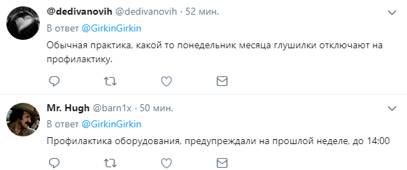 "Обычная практика, какой-то понедельник месяца глушилки отключают на профилактику", "Профилактика оборудования, предупреждали на прошлой неделе, до 14:0", - пишут комментаторы.