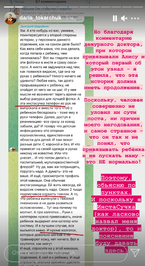 "Кто-нибудь из вас, умники, поинтересуется у второй стороны истории, у персонала данного отделения, как на самом деле было? Как вела себя мама, что она делала, когда попала к ребенку, чем занималась? Любая мать, так долго прорывавшаяся к ребенку, не отойдет от него ни на шаг. И у нее мысли не возникнет терять время на выбор ракурса для лучшей фотки. А эта инстасамка телефон из рук не выпускала, и вместо того, чтоб с ребенком беседовать – тоже ему в руки телефон", - отреагировал Шарайкин.