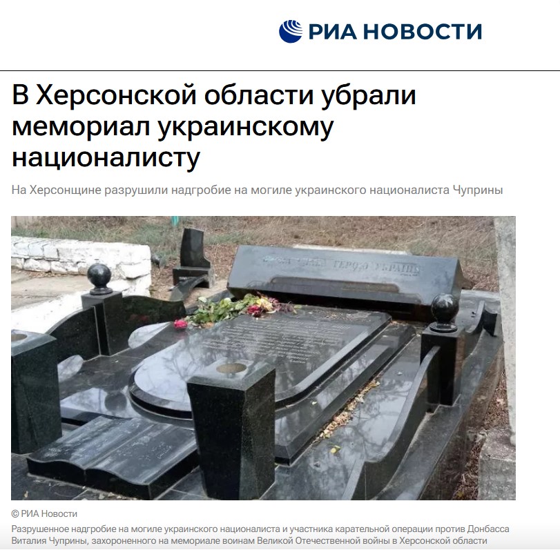 Украинское издание "IPC-Юг" обратило внимание, что оккупанты пытаются отрицать свою причастность к вандализму и пишут, что надгробие якобы разрушили "неизвестные". За несколько недель до этого пропаганда начала "готовить почву", сообщая, что якобы сами местные жители требуют перенести это захоронение. Но никаких доказательств, что это была инициатива местных жителей, не приводилось.