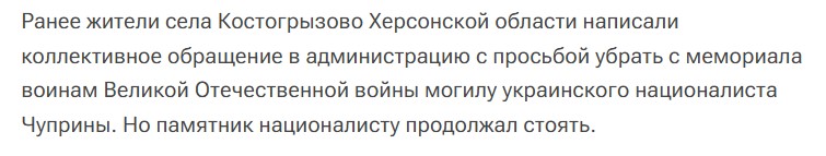 "Это в очередной раз указывает на то, что вандалами являются именно россияне, ведь жители Костогрызового, у которых якобы брали комментарий медиа оккупантов, не могли бы спутать имени своего односельчанина. Некоторые "журналисты" написали, что акт вандализма вообще произошел в городе Херсон, из которого россияне сбежали еще два года назад", – отметили украинские журналисты.