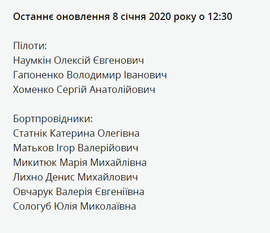 "По предварительной информации представителя авиакомпании "Международные авиалинии Украины", 8 января 2020 годы после взлета из международного аэропорта Имам Хомейни (г. Тегеран) пассажирский самолет авиакомпании МАУ потерпел катастрофу и упал недалеко от аэропорта. По информации, которая уточняется, пассажиры указанного рейса и экипаж погибли. уточненная информация по погибшим гражданами Украины будет отправлена дополнительно", - сказал он.