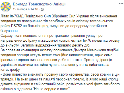 Командир экипажа самолета ИЛ-76МД, который выполнял задание, полковник Дмитрий Мимриков говорит, что миссия "несла определенную эмоциональную нагрузку", поскольку именно иранская сторона была признана виновной в гибели лайнера. Однако от местных жителей украинцы слышали только слова сочувствия и извинений за сбитый самолет.