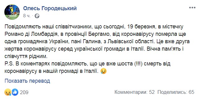"Это уже вторая жертва коронавируса среди украинской общины в Италии. Вечная память и соболезнования родным. P.S. В комментариях сообщают, что это уже шестая (!!!) смерть от коронавируса в нашей общине в Италии", - отметил он.