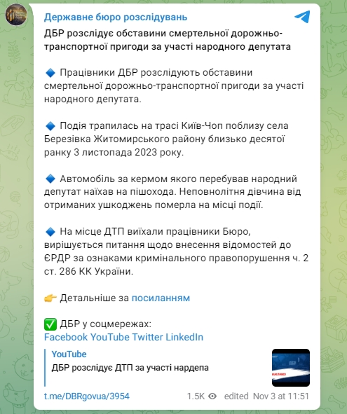 ДТП произошло на территории Житомирской области. Предварительно известно, что в автомобиле народный избранник находился с женой. В Нацполиции уточнили, что водитель автомобиля Mercedes-Benz GLE совершил наезд на пешехода, двигаясь в направлении г. Чоп в крайней левой полосе движения, совершил наезд на пешехода. Также сообщается, что за рулем находился 44-летний житель Киевщины, народный депутат Украины, но не сообщили, кто именно.