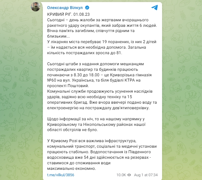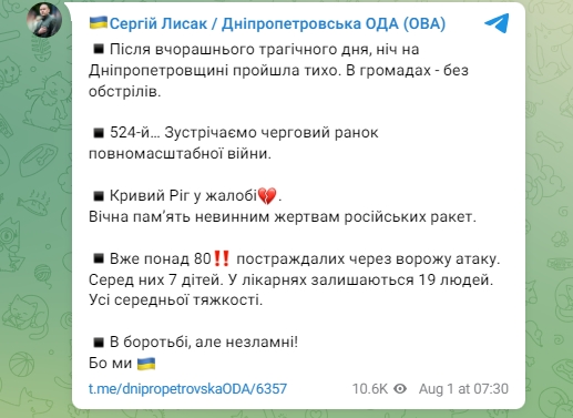 "После вчерашнего трагического дня ночь на Днепропетровщине прошла тихо. В громадах – без обстрелов. Уже более 80 пострадавших из-за вражеской атаки. Среди них 7 детей. В больницах остаются 19 человек. Все средней тяжести", - написал Лысак.