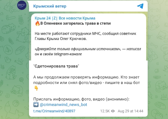 Добавим, что согласно версии оккупационных властей Крыма, в районе Оленевки просто загорелась сухая трава.