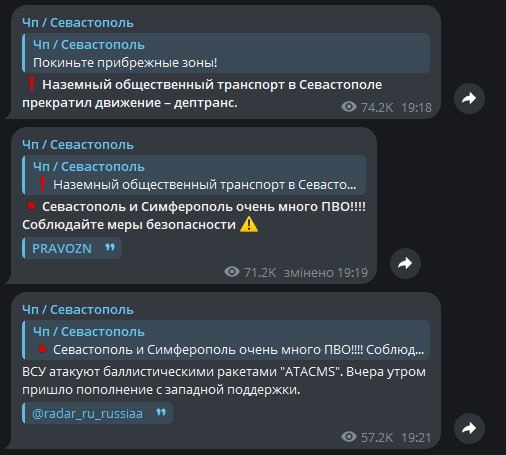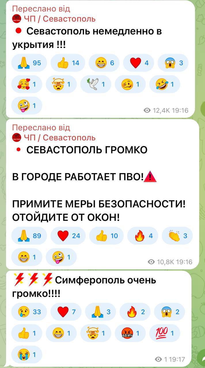 Канал "Крым.Реалии" писал, что российский так называемый глава города Михаил Развожаев указывал на угрозу баллистической атаки в Севастополе. Также крымские Телеграм-каналы сообщали о взрывах в Симферополе. В группе также вспоминают слова советника российского главы - Олег Крючков указывал, что в районе Симферополя вела работу российская ПВО. По его утверждению, пострадавших и разрушений вроде как нет.