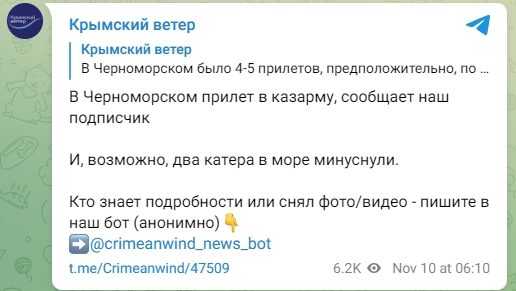 "В Черноморском прилет в казарму, сообщает наш подписчик. И, возможно, два катера в море минуснули", - пишут в паблике.