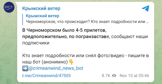 "В Черноморском было 4-5 прилетов, предположительно, по погранзаставе, сообщают наши подписчики", - говорится в сообщении