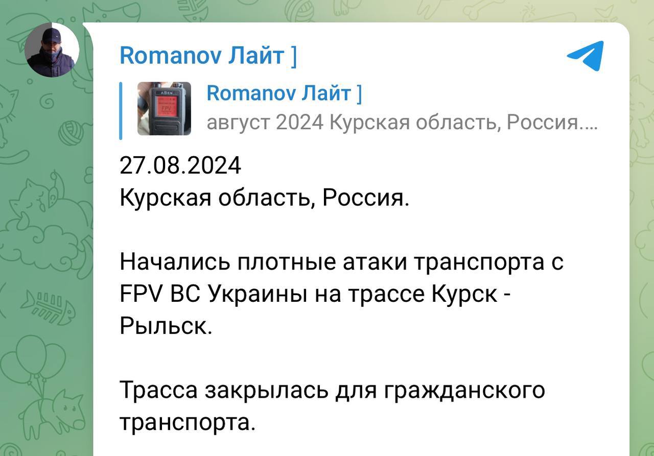 Российский военкор Владимир Романов пожаловался на полное перекрытие трассы Курск-Рыльск.