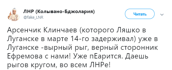 "Арсенчик Клинчаев (которого Ляшко в Луганске в марте 14-го задерживал) уже в Луганске - вырный рыг, верный сторонник Ефремова с нами! Уже пЕарится. Даешь рыгов кругом, во всем ЛНРе!", - говорится в сообщении.