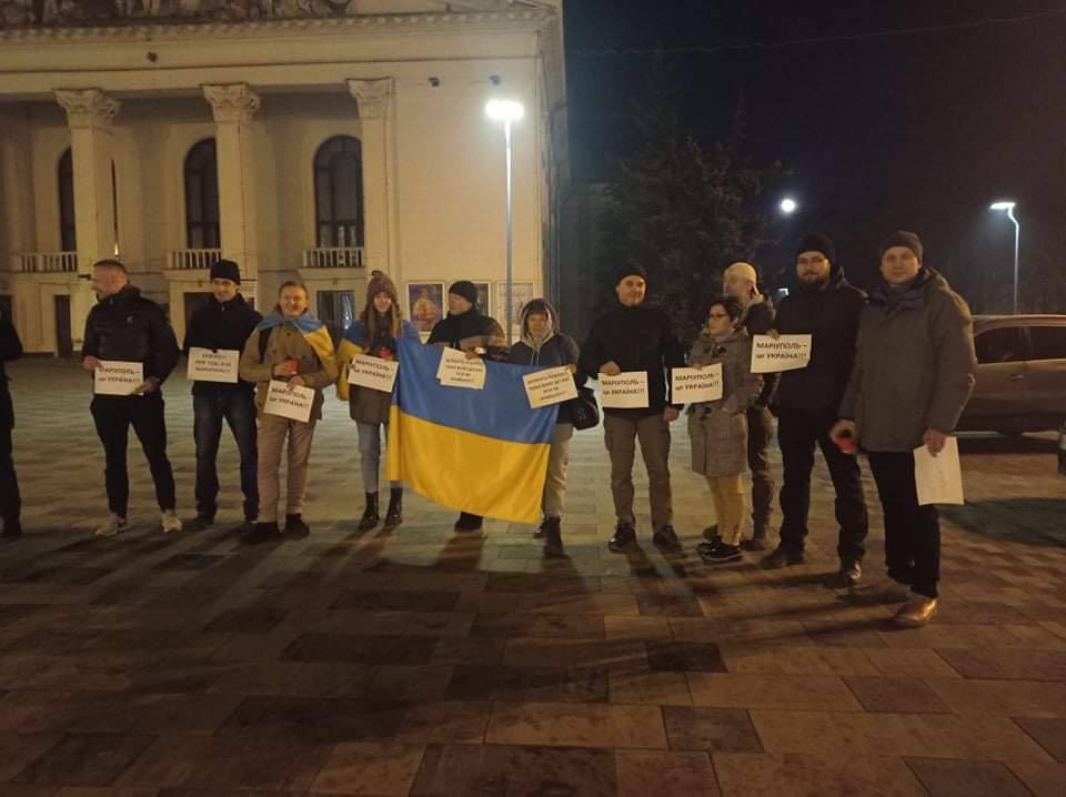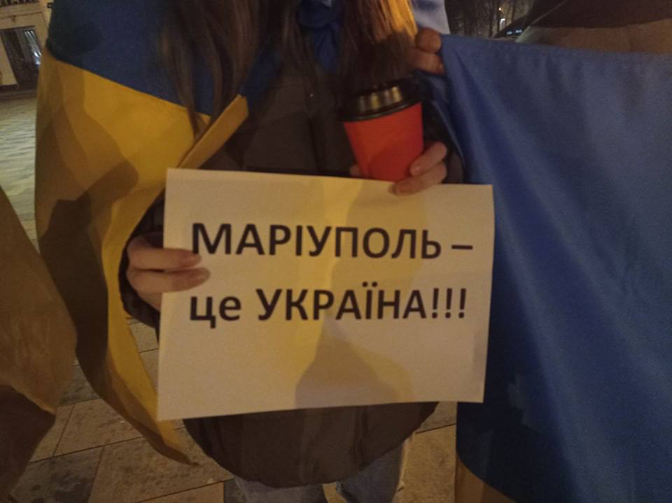 Люди вышли ночью с лозунгами "Мариуполь – это Украина" и с украинскими флагами.