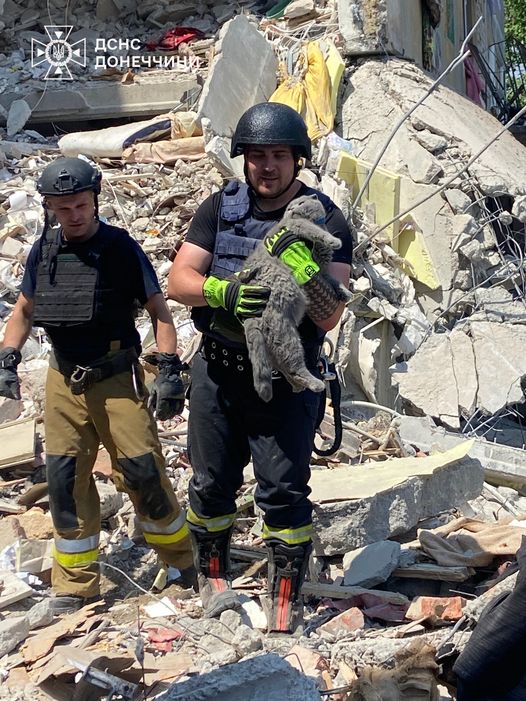 Спасатели ГСЧС полтора суток проводили аварийно-спасательные и поисковые работы на месте обстрела: "Разбирая завалы, сквозь пыль и обломки, чрезвычайники услышали жалобное мяуканье. Это был звук надежды, стон маленького создания, которое умоляло о помощи".