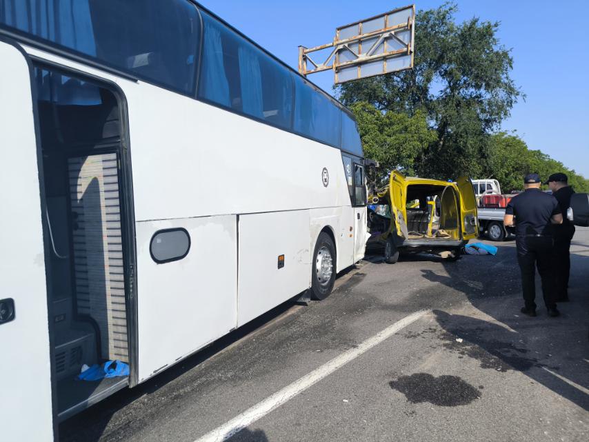 В полиции рассказали, что водитель легковушки начал разворачиваться на трассе через сплошную разделительную линию и в него врезался автобус.