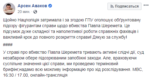 "В деле об убийстве Павла Шеремета идут активные следственные действия, суд вскоре выберет подозреваемым меры пресечения. Но, учитывая общественное значение этого дела, мы проведем срочный брифинг, предоставим всю возможную информацию о ходе расследования", - написал он.