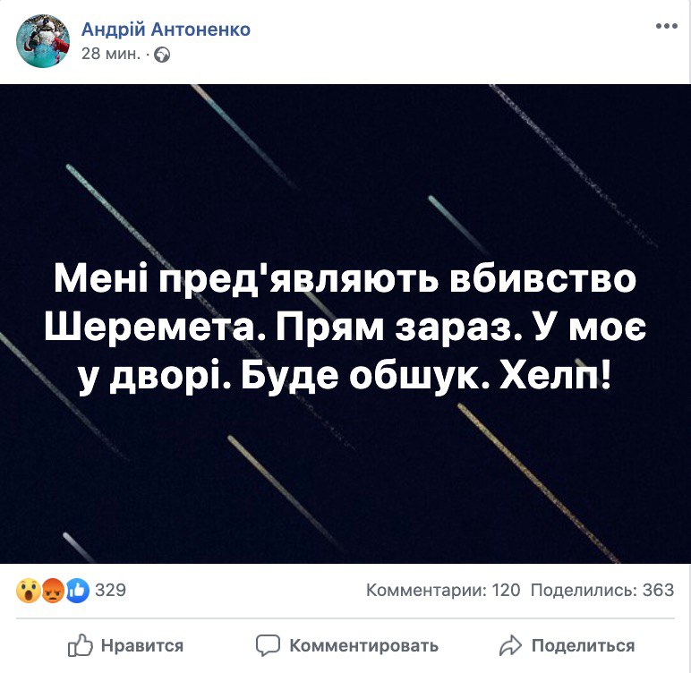 Пост о том, что идет задержание и обыск по этому делу опубликовал в Facebook боец ССО, а сейчас музыкант и лидер группы "Рифмастер" Андрей Антоненко.