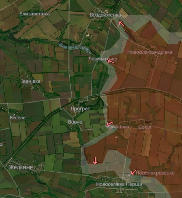 аналитики DeepState сообщают о продвижении россиян возле Лозоватского, Прогресса, Воздвиженки и Новоселовки Первой.