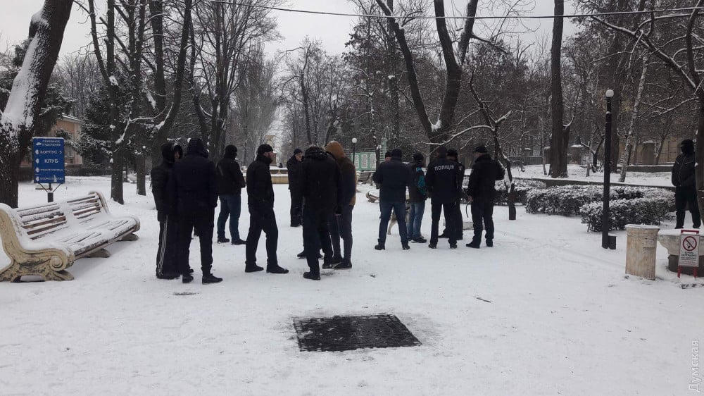 На месте инцидента присутствуют полицейские, сторонники "Укпрофздравницы", а также большая группа мужчин, которые прячут лица.