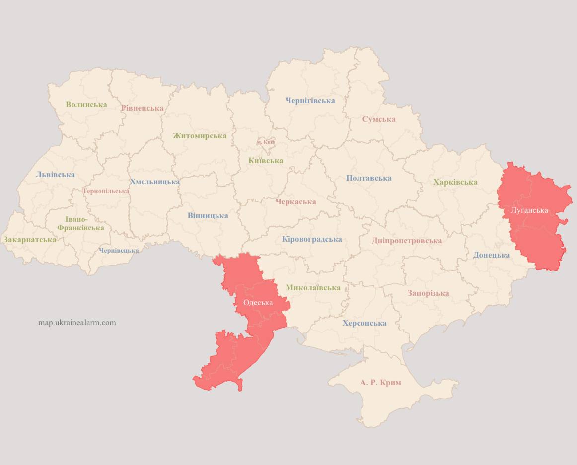 Стоит отметить, что в это время тревога объявлена в двух областях - Луганской, которая последние несколько месяцев постоянно окрашена в красный цвет, и собственно Одесской.