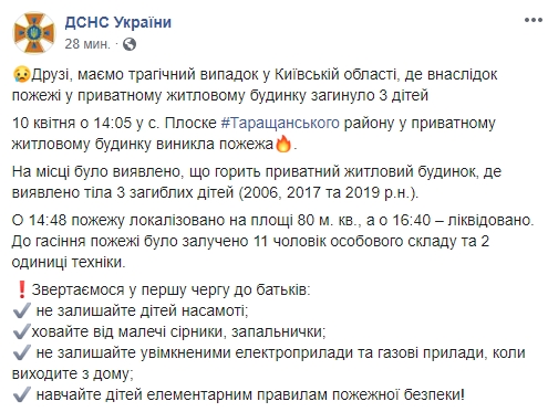 В пятницу, 10 апреля, в селе Плоское в Киевской области в частном доме произошел пожар, который унес жизни троих детей.