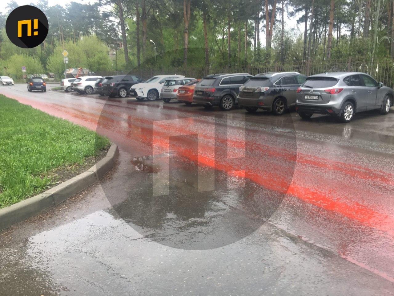 В Новосибирске (РФ) на улицах после дождя появились багровые реки.